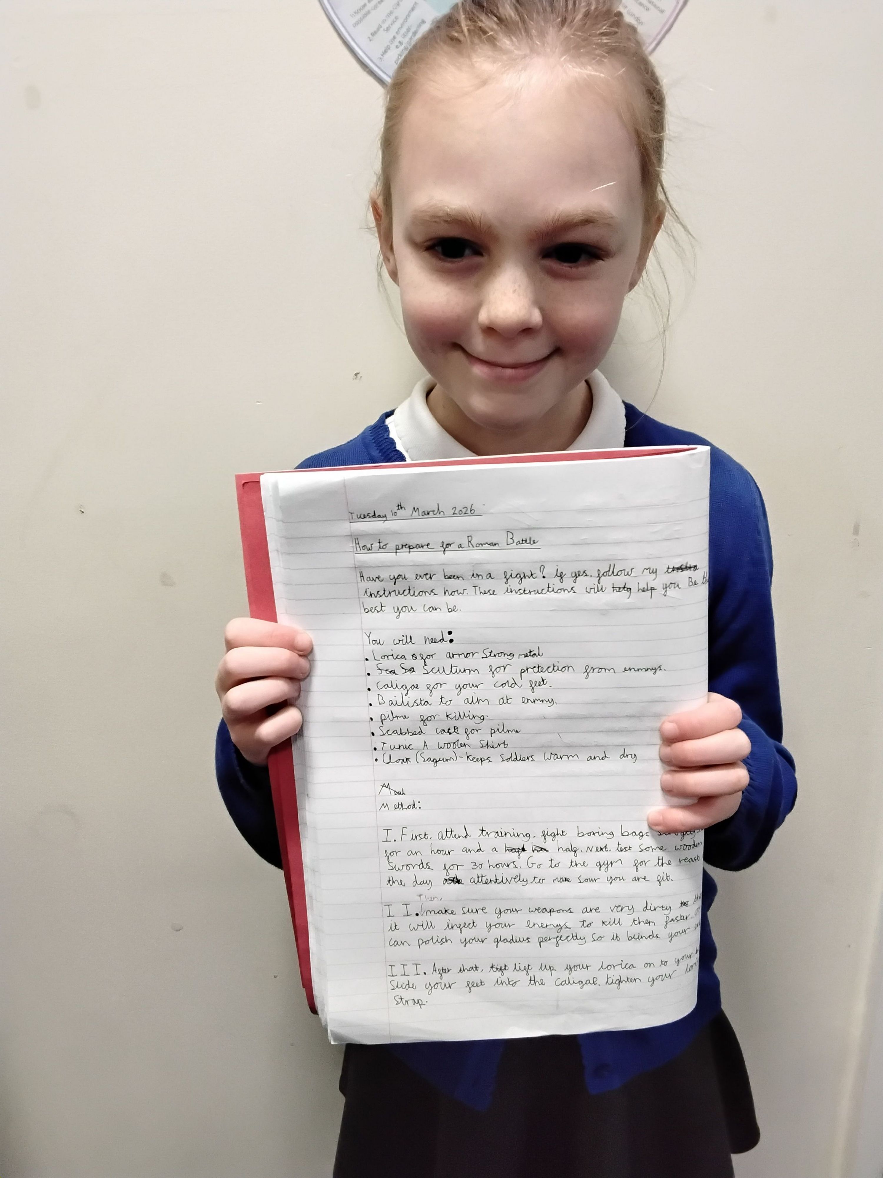 This week, 4 Jackson have written their instruction text on 'How to train for a Roman battle'. The children have spent the past 3 weeks learning the features of an instruction text and have been exploring what life was like as a Roman soldier. They have also been learning lots of Roman vocabulary to enrich their writing. The children have shown enthusiasm and engagement in this topic and their final pieces of writing are fantastic!