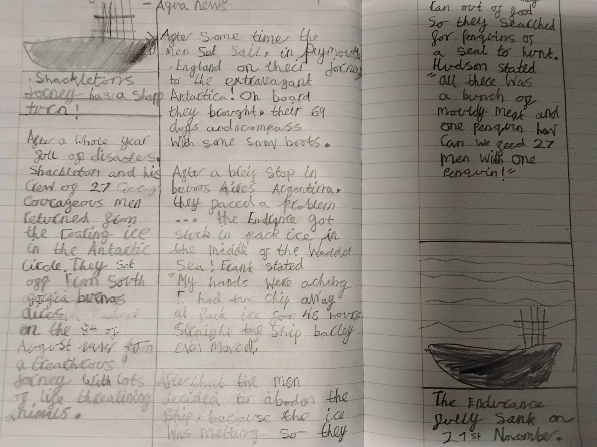 Over the past few weeks, Year 4 have been fully immersed in the true story of Ernest Shackleton and his expedition to Antarctica in 1914. The children have taken on the challenge of becoming newspaper reporters to write an article for the story. They enjoyed being interviewers and crew members to gather quotes for their newspaper report. We have explored the key features of a newspaper article and the children have begun writing their reports using the skills they have learnt.
