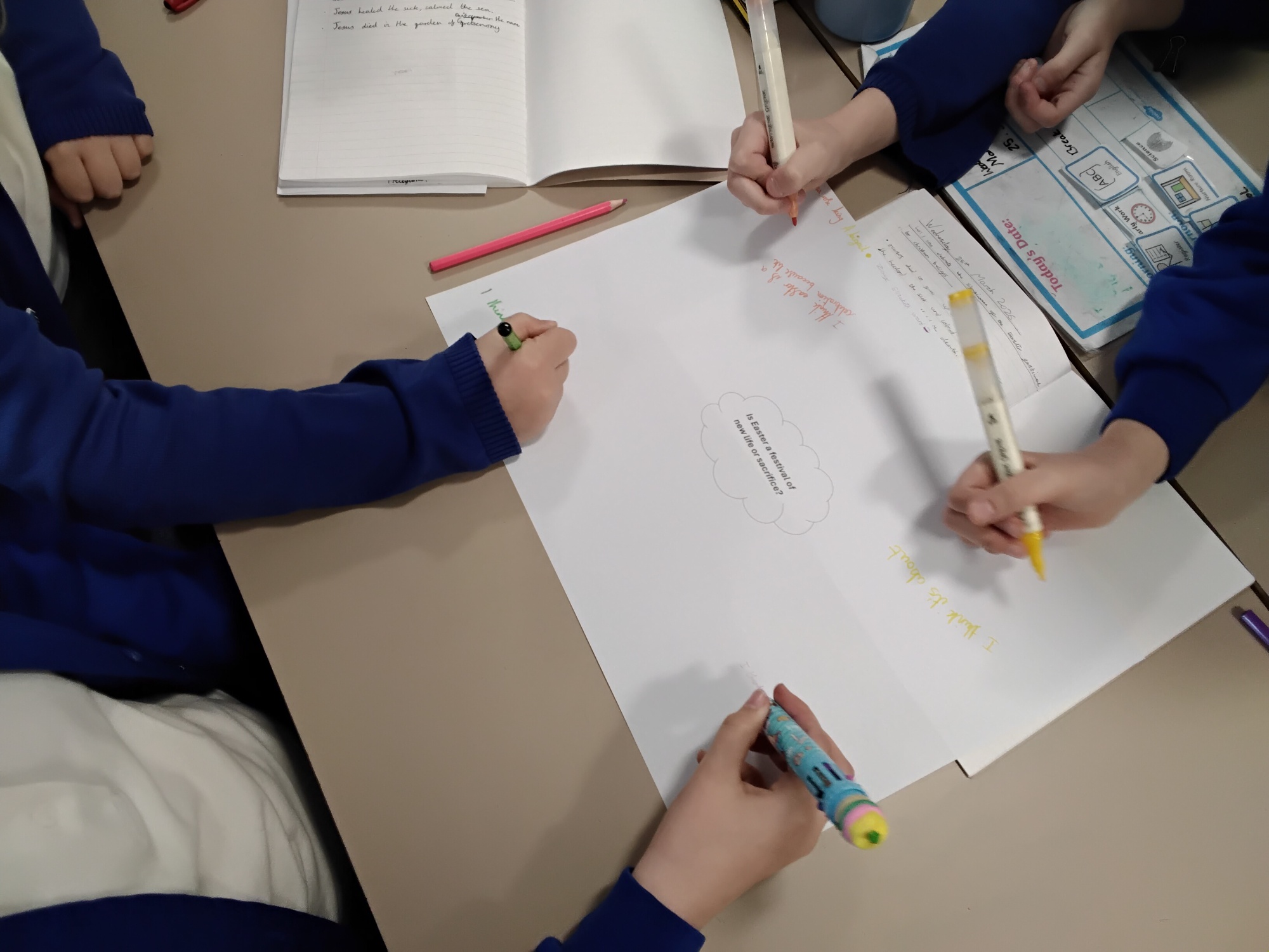 We've been busy with our foundation subjects too. In Geography, we've used digital ordinance survey maps to look at Colchester and identify key symbols. In PSHE, we've been learning how to give first aid to someone who is bleeding or has a head injury. We used the fantastic British Red Cross First Aid Champions website and then role-played scenarios of how to keep calm and apply our first aid knowledge. In RE, we've been focusing on the Easter story and its significance to Christians. We held a silent debate to consider the question: Is Easter a festival of new life or sacrifice?