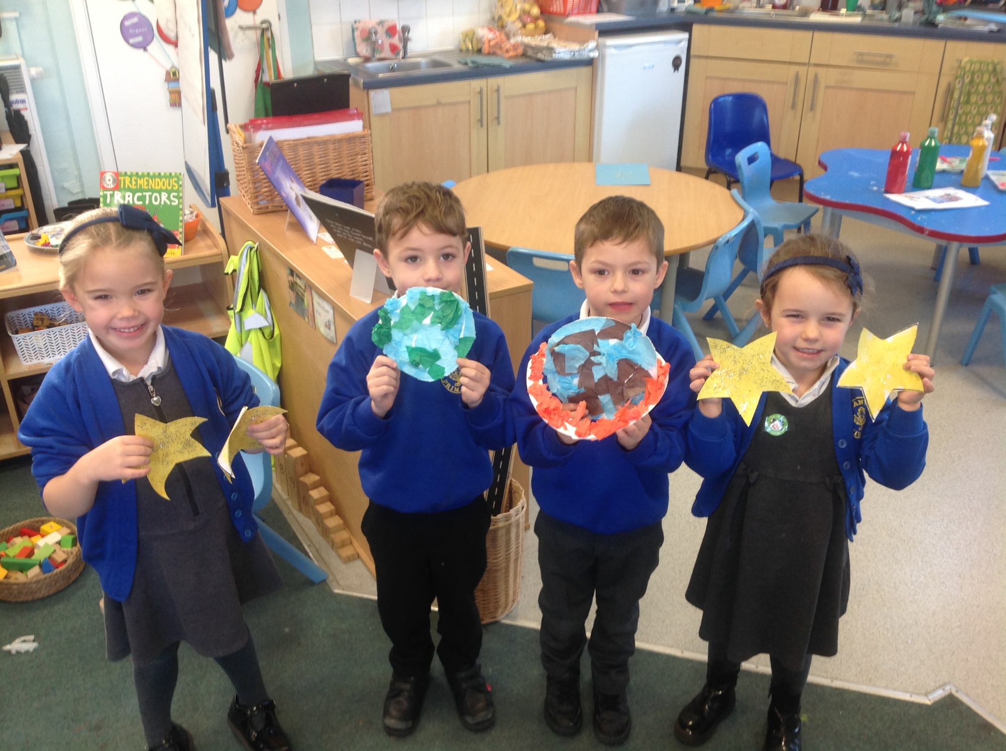 These last 2 weeks we have been zooming off into space! We learnt all about Astronaut Chris Hadfield and how he was scared of the dark as a little boy. He overcame his fear and became a very famous space explorer. We enjoyed his story The Darkest Dark, and we have been making our own space-themed work, creating our own class solar system and twinkly stars.